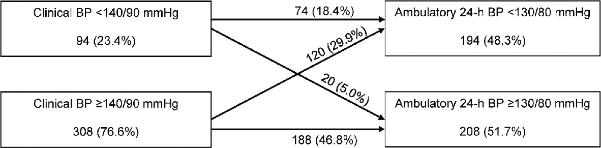 Figure 1. Flowchart showing the prevalence of well and poorly controlled levels of clinical and ambulatory 24-h blood pressure (BP) in 402 outpatients with peripheral arterial disease.