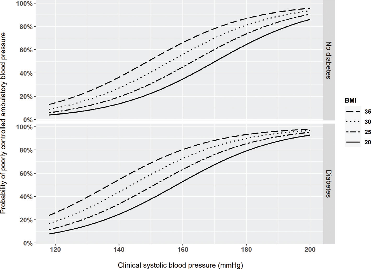 Figure 3. Probability of poorly controlled ambulatory 24-h blood pressure (i.e. ≥130/80 mmHg) according to the clinical systolic blood pressure, body mass index (BMI) in kg/m2, and occurrence of diabetes mellitus. The probabilities are adjusted for the variables shown in Table 2.