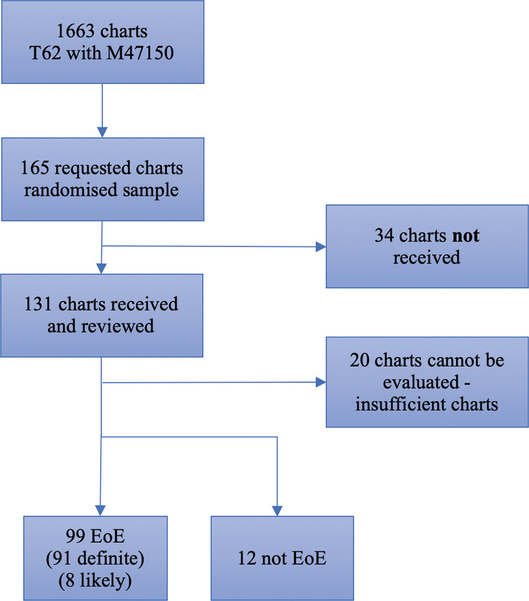 We received patient charts from 131 individuals with a histopathology code for eosinophilia in the esophagus (M47150). In 111 (85%), there were sufficient data to confirm or reject the diagnosis of EoE.