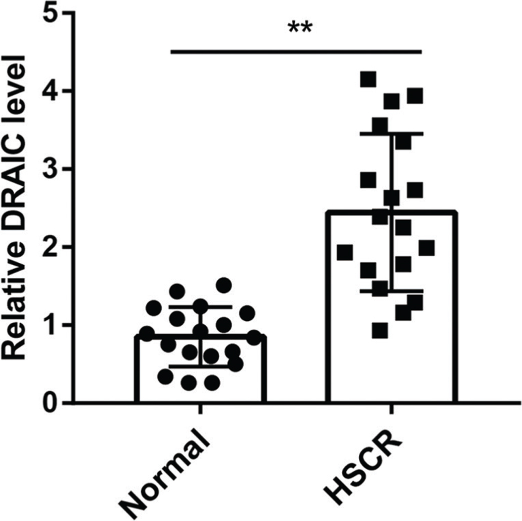 Figure 1. DRAIC is up-regulated in HSCR bowel stenosis tissues. The expression of DRAIC in HSCR bowel stenosis tissues (n = 18) and normal colon tissue (n = 18). DRAIC was significantly increased in HSCR compared with normal. Data are reported as mean ± SD. **P < 0.01 versus normal group.