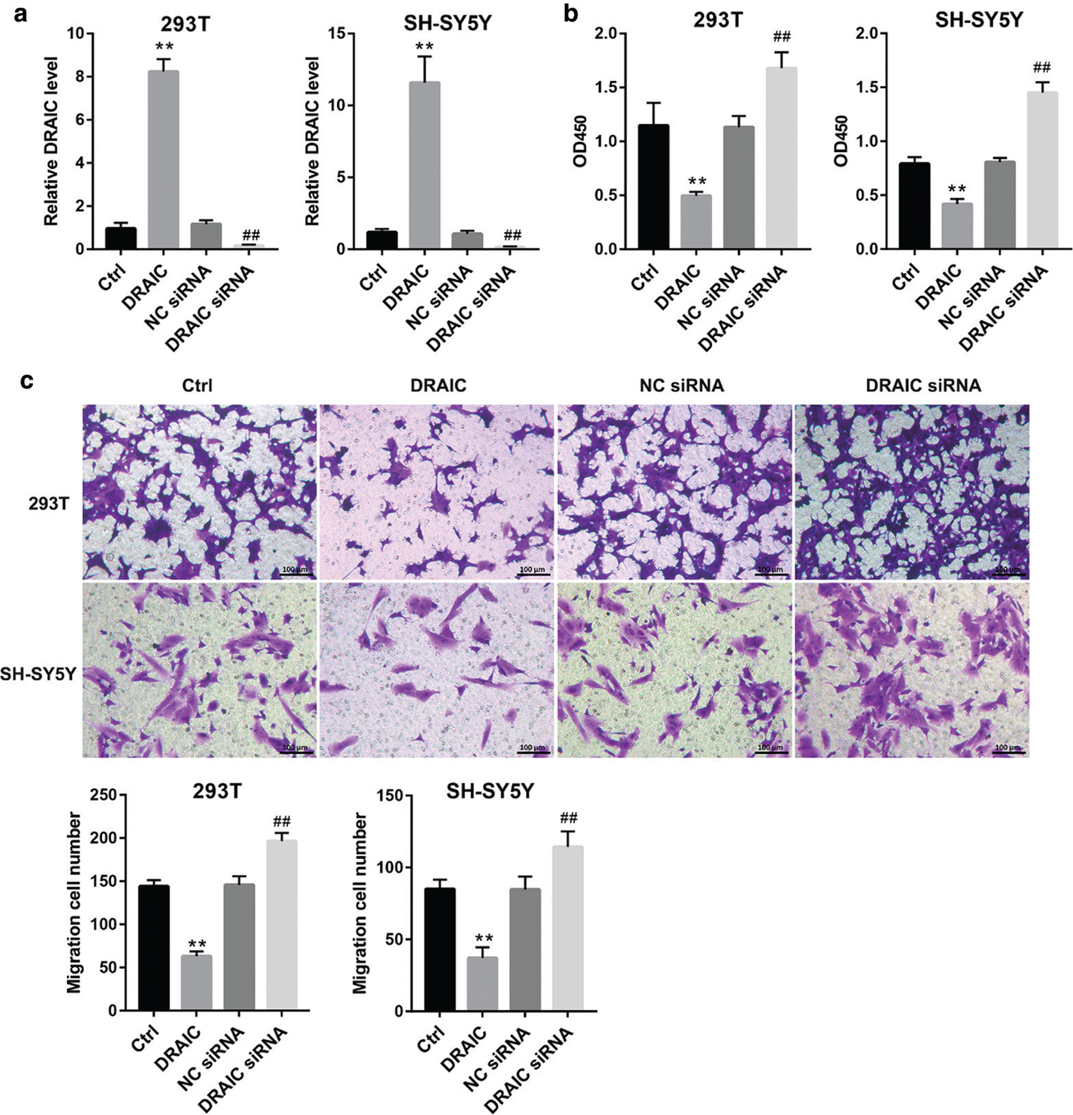 Figure 2. Overexpression of DRAIC inhibits cell proliferation and migration in HSCR The293T and SH-SY5Y cells were transfected with DRAIC overexpression plasmid or targeted interference sequence, respectively. (a) The overexpression and knockdown efficiency of DRAIC were detected by qRT-PCR. (b) The cell proliferation was measured by CCK-8 kit. (c) The cell migration was analysed by Transwell assay. Data are expressed as mean ± SD. **P < 0.01 versus Ctrl group. ##P < 0.01 versus NC siRNA group.