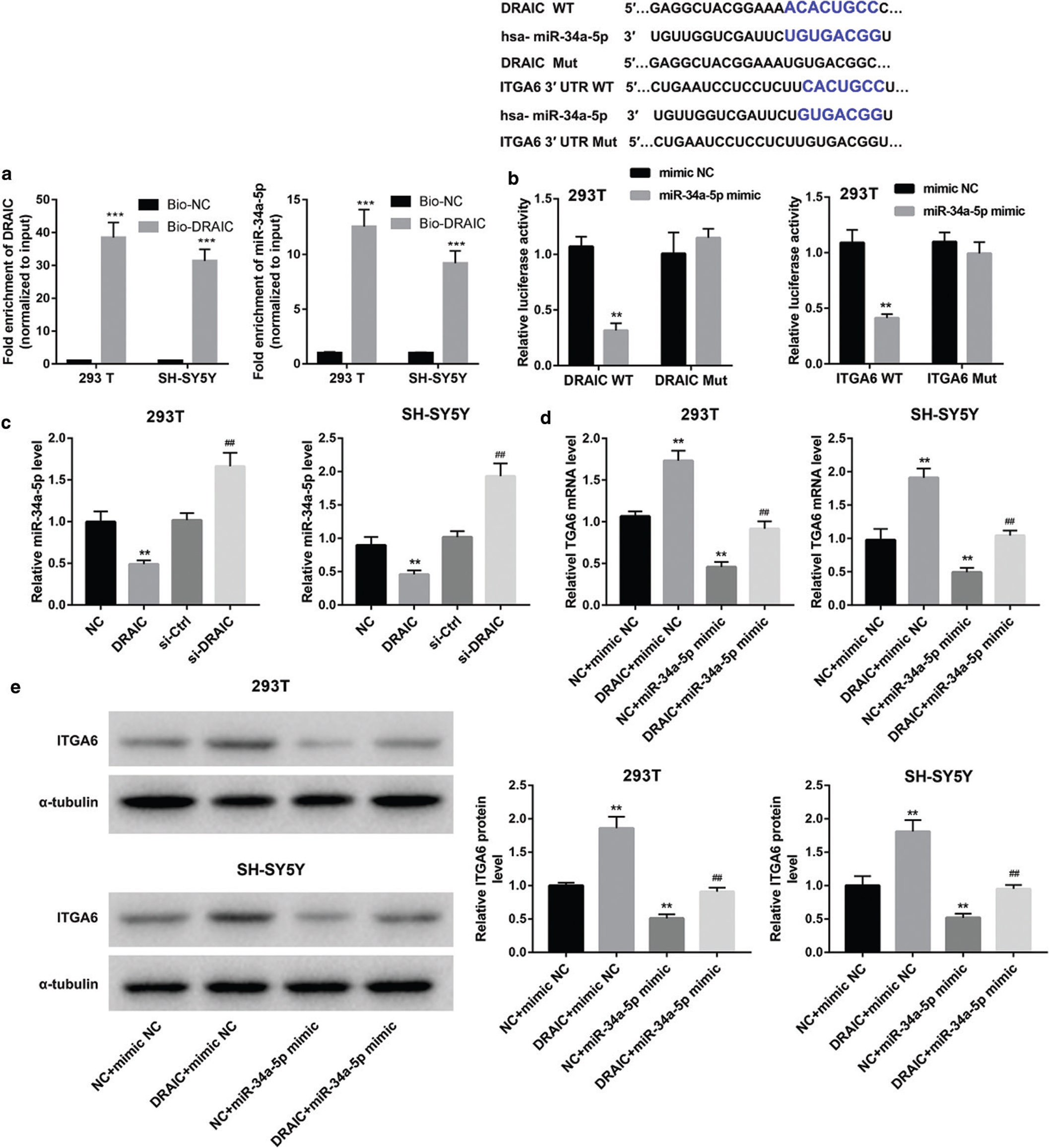 Figure 3. DRAIC regulated the expression of ITGA6 in cells by sponging miR-34a-5p. (a) RNA pull-down assay was used to identify the relationship between the miR-34a-5p and DRAIC. (b) Luciferase activity experiment proved that miR-34a-5p and DRAIC had binding sites, and miR-34a-5p directly bind to ITGA6 3’UTR. (c) The expression level of miR-34a-5p was detected by qRT-PCR in 293T and SH-SY5Y cells transfected with DRAIC overexpression plasmid or interference sequence. (d, e) mRNA and protein expression levels of ITGA6 were determined by qRT-PCR and Western blot, respectively. The blue text shows the binding site of the two genes. Data are reported as mean ± SD. **P < 0.01, ***P < 0.001 versus Bio-NC or mimic NC and/or NC group. ##P < 0.01 versus DRAIC + mimic NC group.