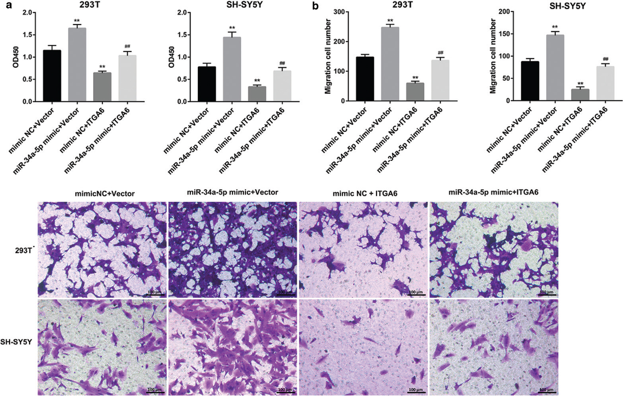 Figure 4. DRAIC inhibits cell proliferation and migration by regulating the miR-34a-5p/ITGA6 signal axis. 293T and SH-SY5Y cells were co-transfected with miR-34a-5p mimic and ITGA6 overexpression plasmid. (a) Cell proliferation was measured by CCK-8 assay. (b) Cell migration was analyzed by Transwell assay. Data are reported as mean ± SD. **P < 0.01, versus mimic NC +vector group. ##P < 0.01 versus miR-34a-5p mimic +vector group.