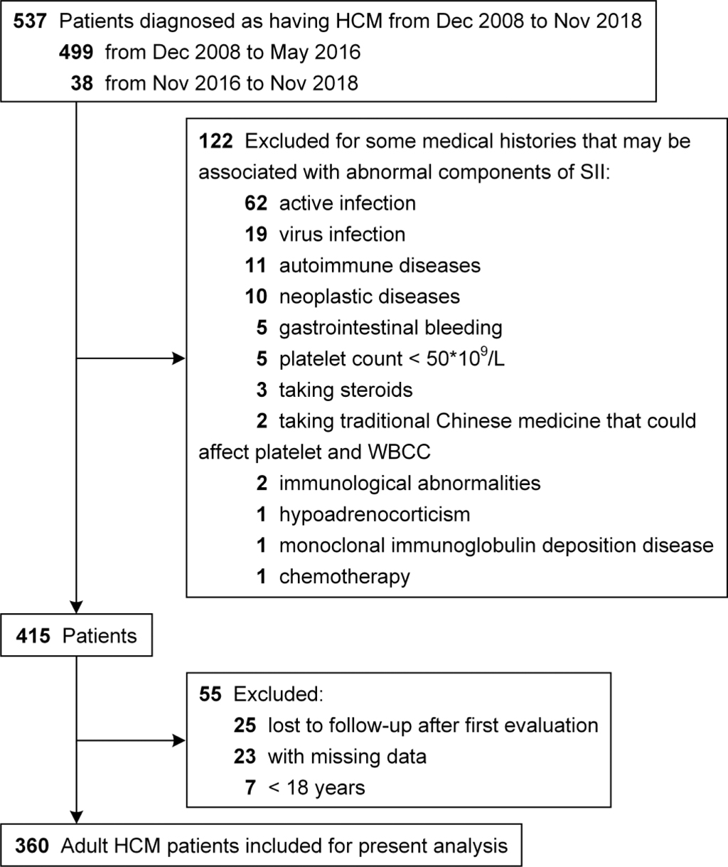 Background: This study investigates the predictive value of the systemic immune-inflammation index (SII), which was calculated as platelet × neutrophil/lymphocyte ratio, for all-cause mortality in patients with hypertrophic cardiomyopathy (HCM).