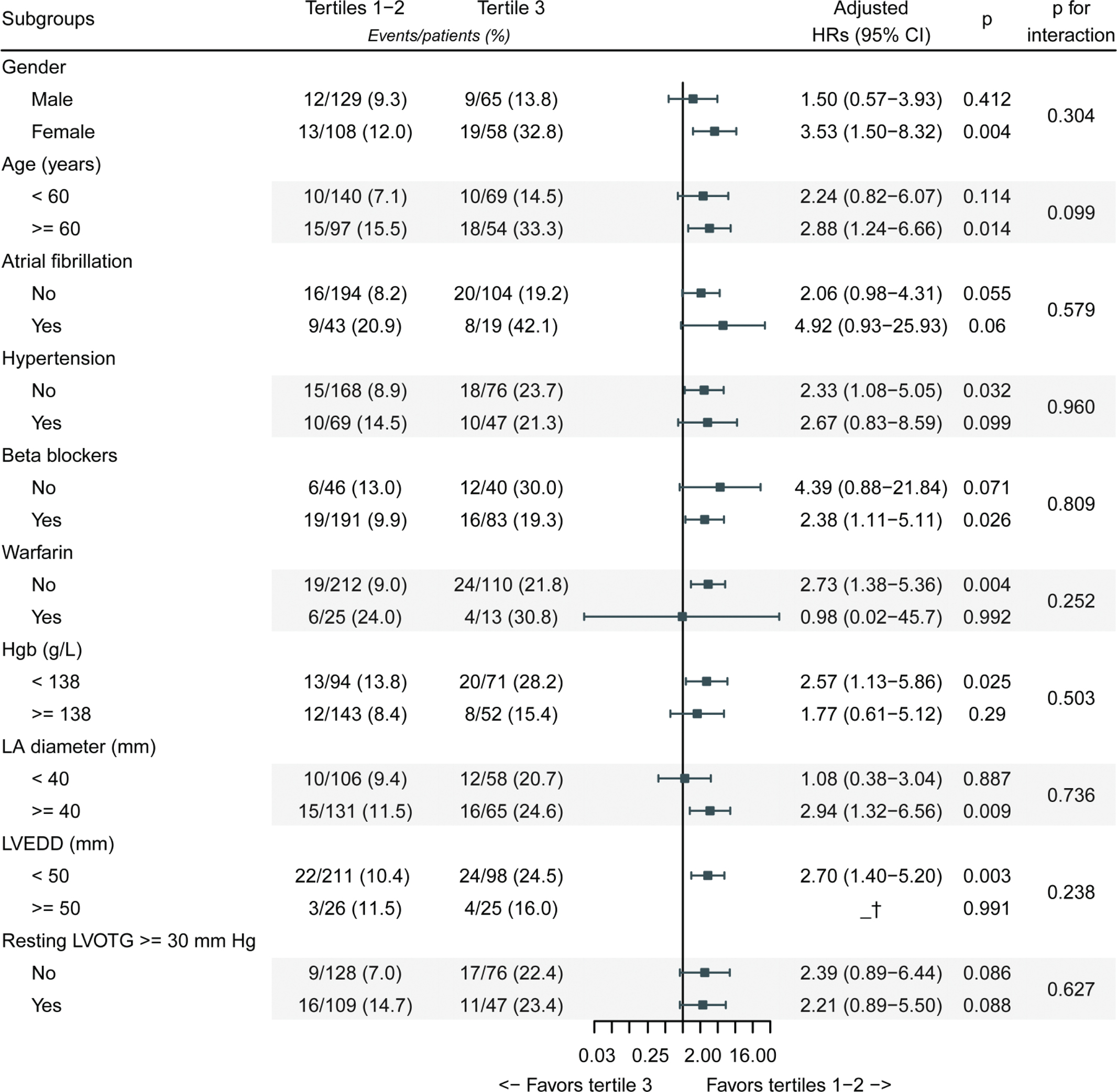 Note: Each stratification adjusted for age, gender, dyspnea, uric acid, TG, monocyte count, LVEDD, LA diameter, and LVEF, except the stratification factor itself. The P-value for interaction represents the likelihood of interaction between variable and SII tertiles. Abbreviations as in Tables 1 and 2.