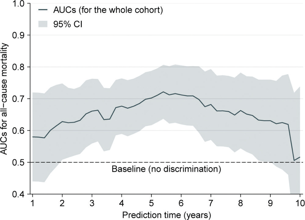 Note: The curve was based on the AUCs, which was calculated every 0.2 years (from 1 to 10 years). In the figure, the solid line depicts the AUCs, and the ribbon represents 95% CI. Abbreviations as in Tables 1 and 2.