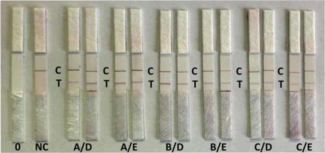 Based on the ELISA results, the A, B, and C antibodies were selected as capture antibodies, whereas D and E antibodies were selected as detection antibodies to be tested on saliva samples from the training set. For that purpose, a series of preliminary experiments with rS1/S2 protein spiked in SARS-CoV-2 negative saliva samples at a concentration of 1 μg/mL were performed to determine working concentrations of the antibody conjugates and sample handling technique (data not shown).