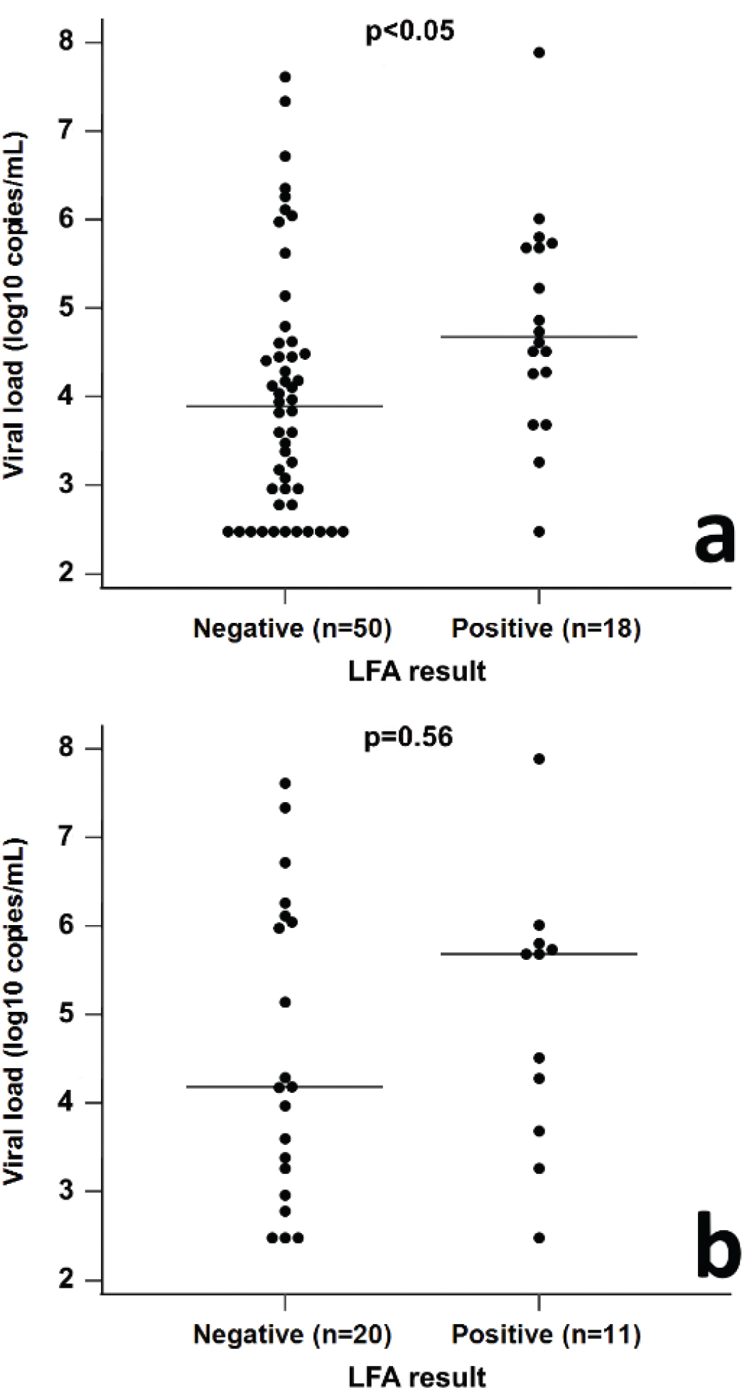 Figure 3. Distribution of the LFA rapid antigen test results of true-positive (rRT-PCR-positive) saliva samples depending on the viral load. (a) The difference in viral load was significant between LFA-positive and LFA-negative sample groups (median 1 × 104.7 vs. median 1 × 103.9 copies/mL, Mann–Whitney, P < 0.05) (n = 68). (b) Results of subgroup analysis that comprised only true-positive samples collected ≤7 days after the symptom onset and saliva samples for whom the time between laboratory-confirmed diagnosis and sample collection was ≤7 days (n = 31). For these samples, the differences between LFA-positive and LFA-negative sample groups with respect to median viral load were not statistically significant (Mann–Whitney, P = 0.56).