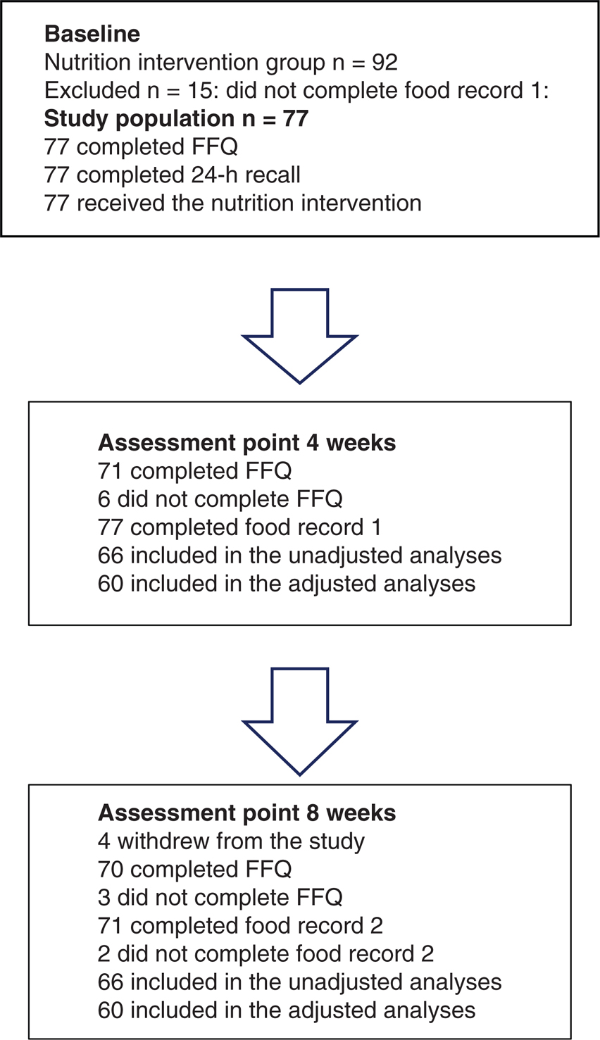 A strength of the present study is the exploration of associations between modified fibre and lactose intakes and nutrient intakes in this patient group, an area rarely explored in previous research. A weakness is the small sample size limiting the power of the statistical analyses. Furthermore, self-reported dietary assessments, such as 24-h recall, FFQ and 4-day dietary food records are associated with measurement errors, such as recall bias (27), and the estimates of energy and nutrient intakes from these are not entirely comparable. To diminish measurements errors for the food records, a booklet with photographs (16) intended to facilitate the estimations of portion sizes, and verbal and written instructions from the dietitians on how to complete the 4-day estimated food records and the FFQ were provided. A limitation regarding the dietary advice is that no goals were formulated in terms of percentages, grams or number of portions, making it difficult to evaluate exactly how much the participants modified their intakes. The FIS and LIS scores were constructed from the FFQ, which did not include portion sizes, meaning that intakes could be very small or quite large; this needs to be taken into consideration when interpreting the results. In addition, the FFQ used in the present study was study-specific, and its validity has not yet been evaluated. Finally, the comparisons between the pre-intervention intakes at baseline from the 24-h recall and intakes in the reference group should be interpreted with some caution. The 24-h recall may not have fully captured usual intakes amongst the participants due to within-subject variation in food intake, and the small sample size was used (27). Another factor that might have contributed to lower intakes amongst the participants at baseline is that the 24-h recall was conducted during the first days of radiotherapy, and it is not unlikely that the treatment had a negative effect on the participants’ usual dietary habits and appetite. This was an observational study; hence, we cannot draw clear conclusions that modified fibre and lactose intakes increased or decreased nutrient intakes; we can only state that there were few statistically significant associations. To draw any conclusions on cause and effect, RCTs with adequate power must be conducted.