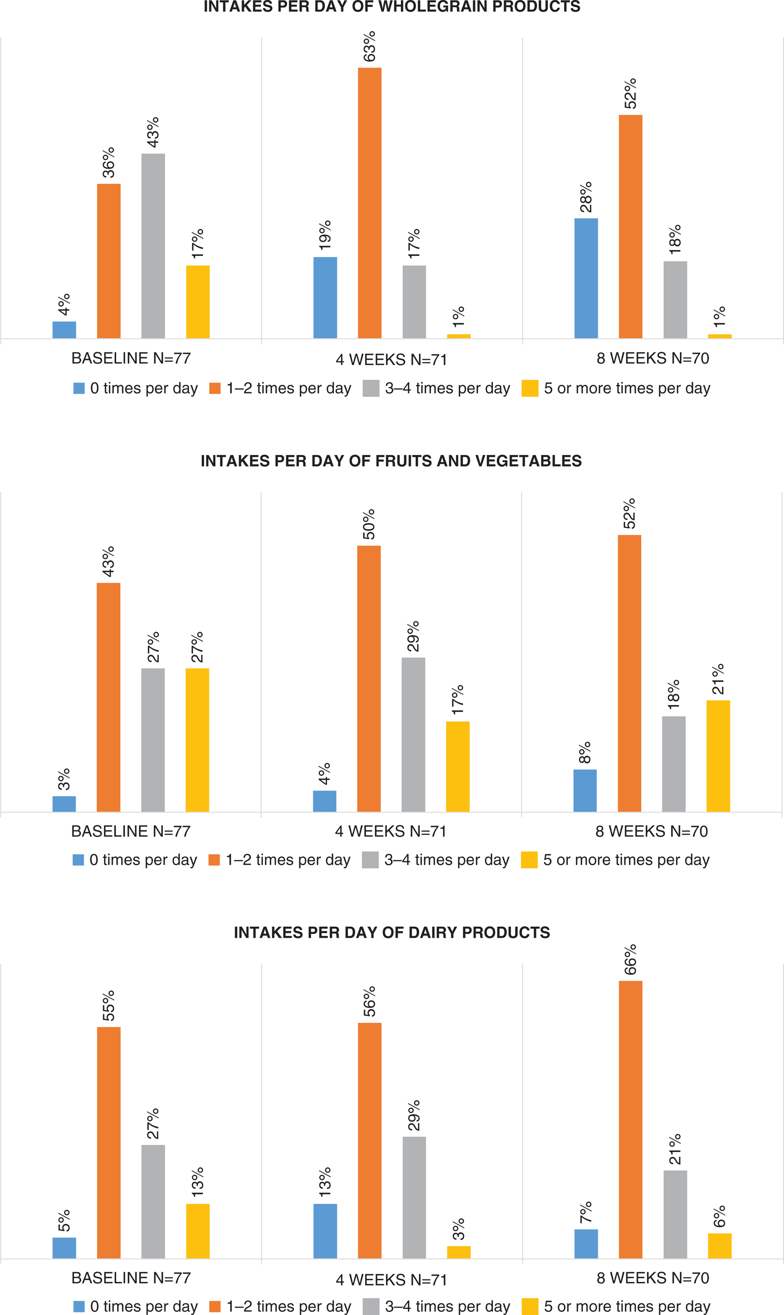 The proportion of participants reporting the lowest number of intakes per days of wholegrain products (≤2 times/day) had increased from baseline to end of treatment, whilst the proportion who reported eating wholegrains ≥3 times/day decreased (Figure 2). The proportion of participants with less frequent intake of fruits and vegetables (≤2 times/day) increased after receiving the dietary advice, and the proportion of participants reporting eating fruits and vegetables ≥3 times/day at follow-up at 4 and 8 weeks had decreased, compared with baseline. Also, a larger proportion of participants reported consuming dairy products ≤2 times/day at follow-up at 4 and 8 weeks, whilst the proportion reporting more frequent intakes decreased, compared with baseline.
