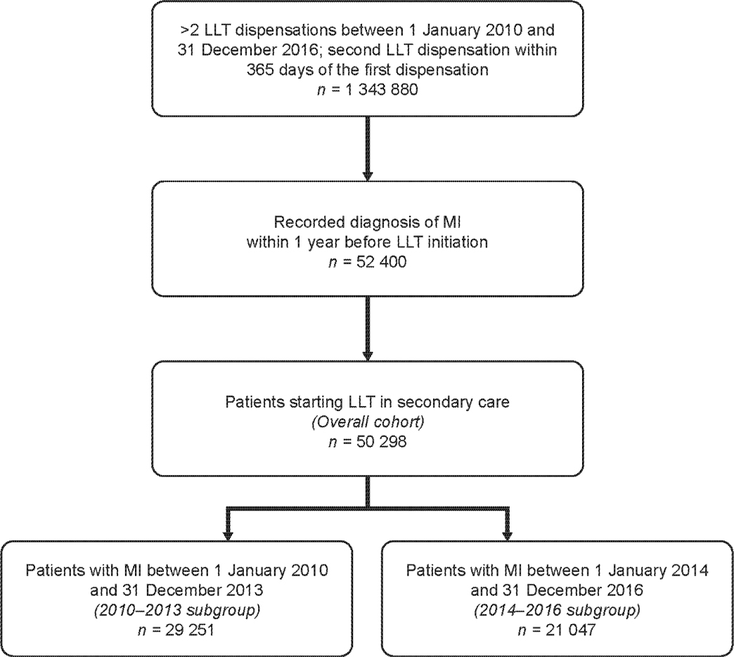 Figure 1. Identification of patients in the overall population and subgroups. LLT: lipid-lowering therapy; MI: myocardial infarction.