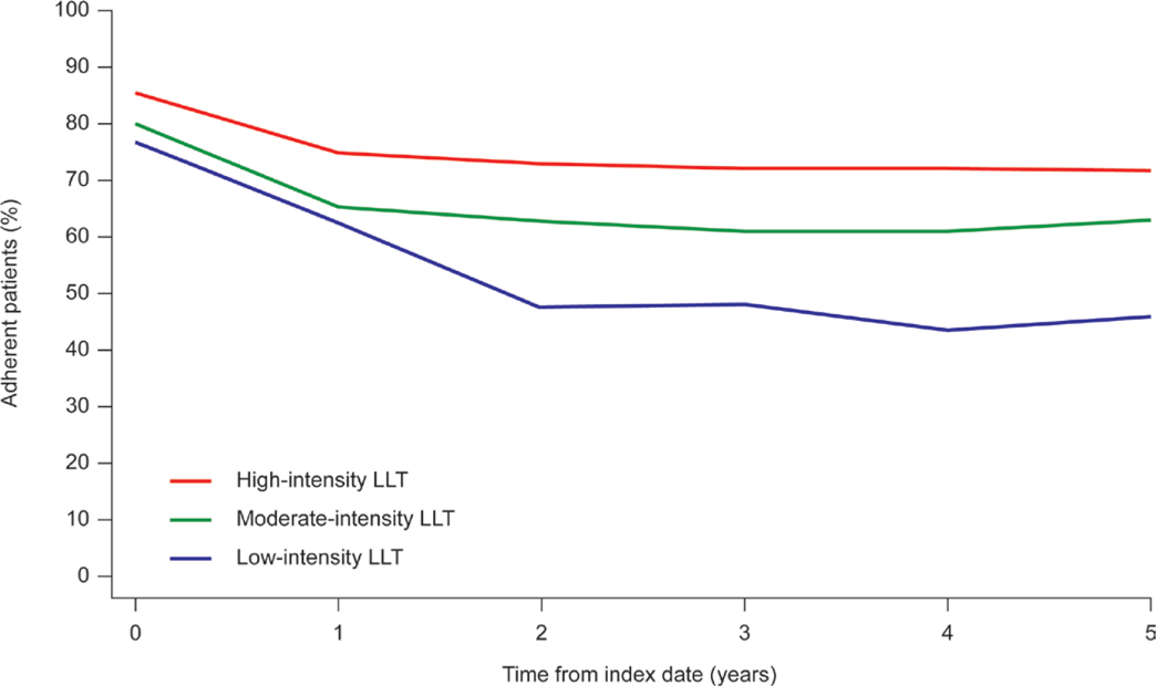 Figure 2. Percentage of adherent patients over time, classified by treatment intensity, in the overall cohort. Adherent patients defined as those with PDC ≥ 0.8. LLT: lipid-lowering therapy; PDC: proportion of days covered.