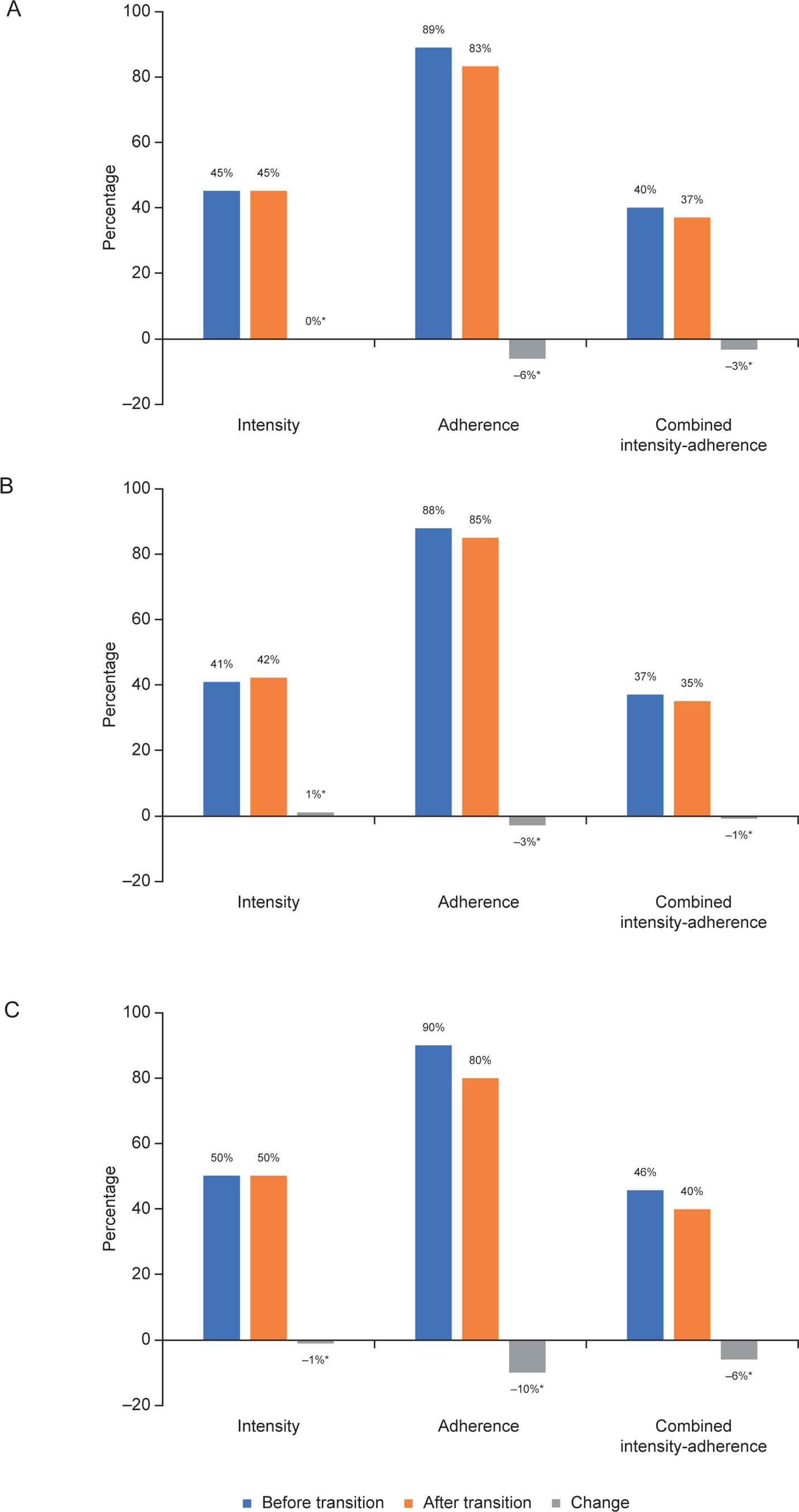 Assessment of treatment patterns before and after transition from secondary to primary care showed that PDC decreased from 89 to 83% in the overall cohort (n = 40,999) (Figure 3). The change was greater in the 2014–2016 subgroup (from 90 to 80%; n = 15,804) than in the 2010–2013 subgroup (from 88 to 85%; n = 25,195). Changes in treatment intensity and in the combined measure of treatment intensity and adherence after transition were numerically small (Figure 3). When comparing the last prescription dispensed before transition to the first prescription dispensed after transition, mean intensity was 49% both before and after transition, in both the 2010–2013 subgroup and the 2014–2016 subgroup.