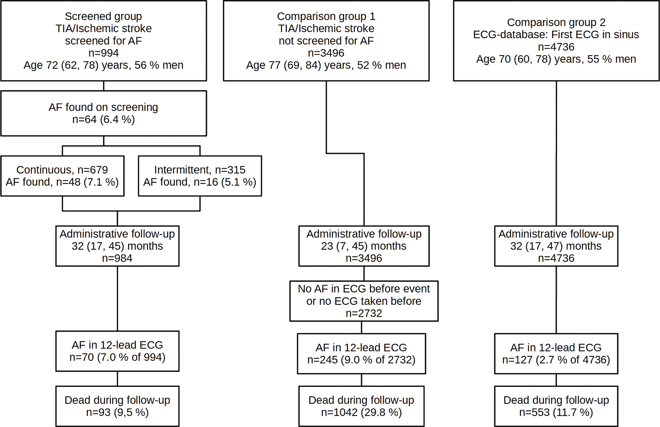 Figure 1. Study flow chart, screened and non-screened patients following stroke or TIA (study group and comparison group 1), and age- and sex-matched patients (comparison group 2) in sinus rhythm at baseline. Age is given as median (quartile 1 and quartile 3). Integer numbers are reported as n (percentage). TIA: transient ischemic attack; AF: atrial fibrillation; ECG: electrocardiogram.