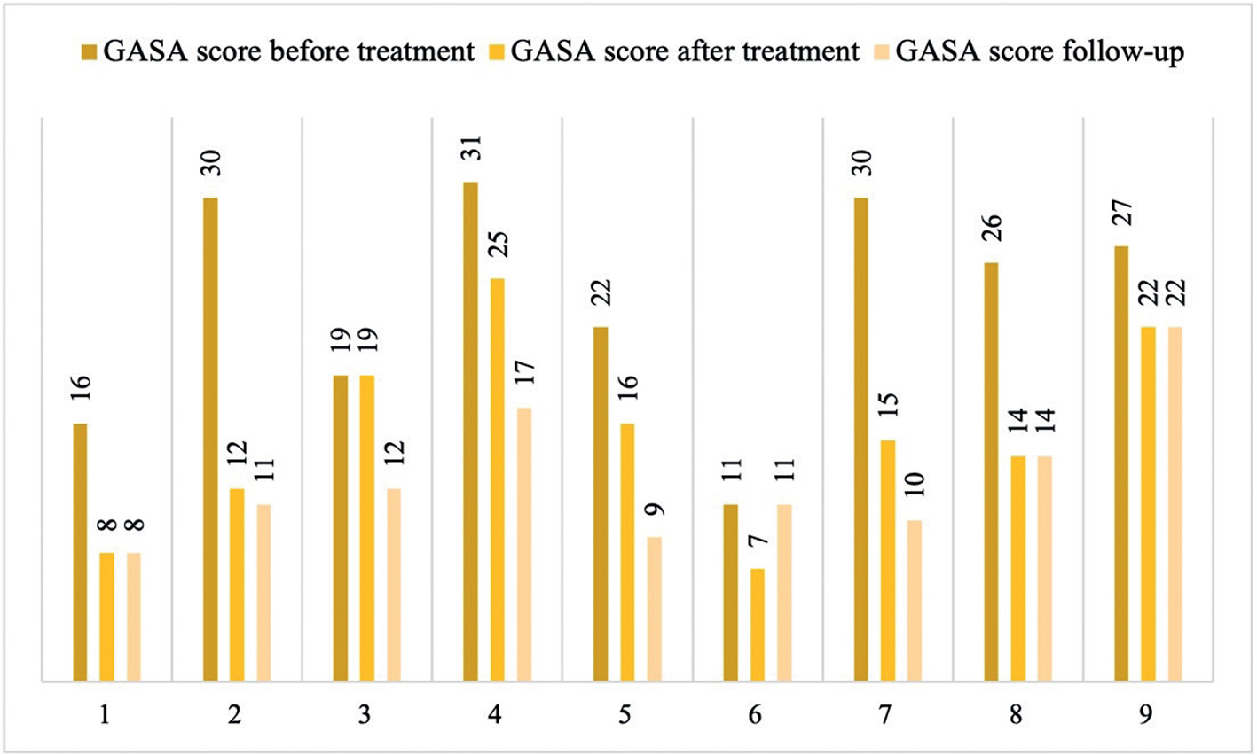 Figure 1. Individual GASA score before treatment, after treatment, and at follow-up.