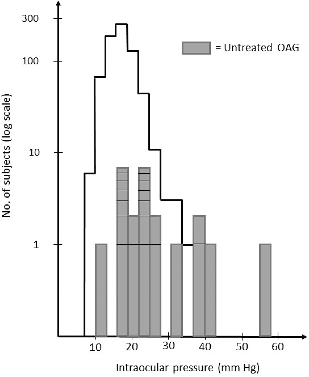 Figure 2. Distribution of the highest pressure in either eye in the study population of 733 participants in the Tierp Glaucoma Survey (3 mm Hg pressure intervals). Twenty-seven individuals were excluded. OAG: open-angle glaucoma.